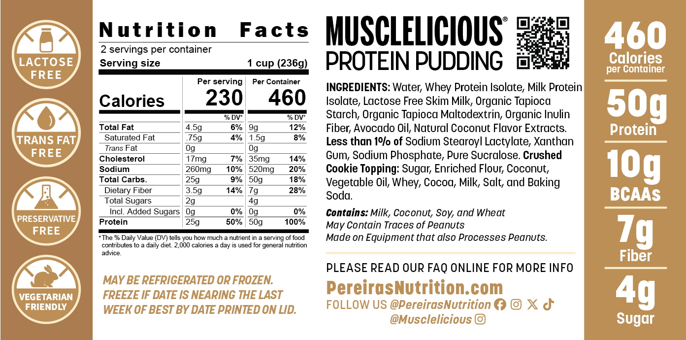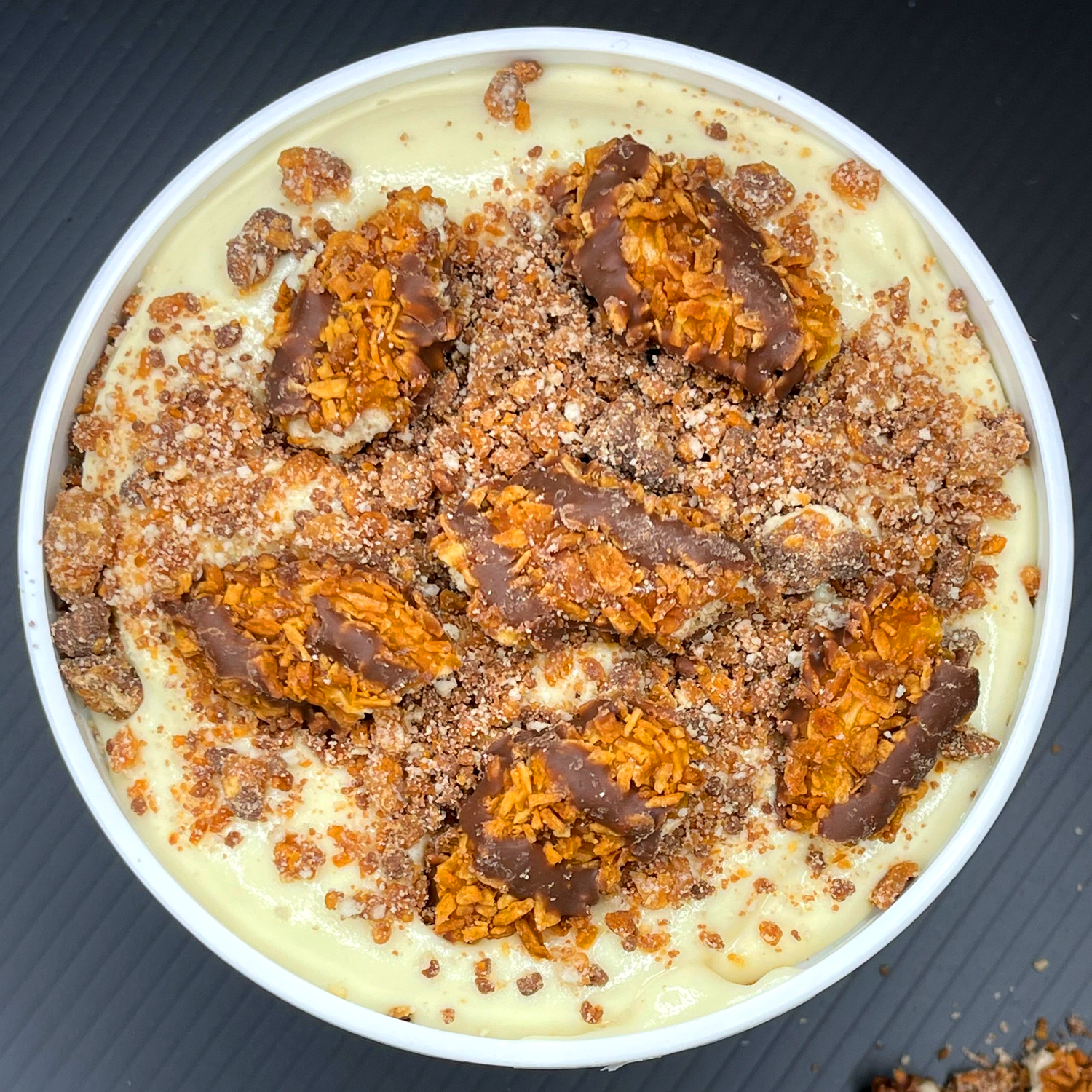 If you have not tried this one, you do not know what you're missing! Do not like coconut flavored products? This will blow and change your mind all in one spoonful. Topped with Coconut Samoa cookies, This top seller will become one of your favorites instantly. Coconut lovers, or not this one is for you! Skip the slice of a high sugar-filled coconut cream pie and satisfy your coconut cream pie craving with heavenly spoonful's of THIS Musclelicious protein pudding. You will feel the smooth summer feeling almost instantly.