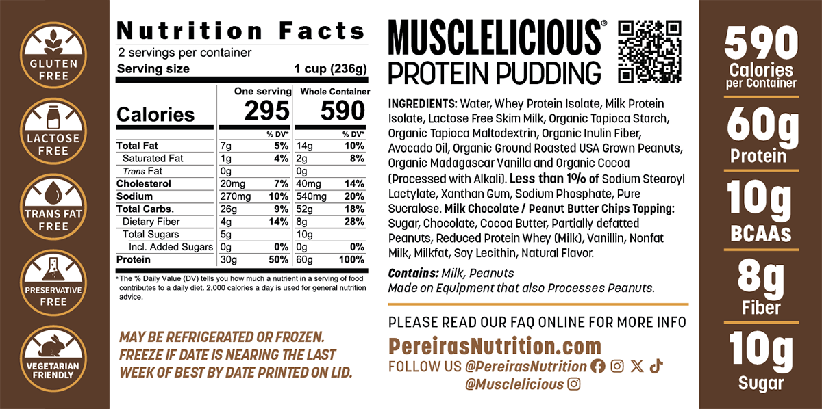One of the most classic flavor combinations, minus the sugar & packed with high quality nutrition. This PN Protein Pudding is our Chocolate Peanut Butter and Vanilla Peanut Butter Pudding swirled together with PB / Milk Chocolate Chips on top. If you’re a Reese's Peanut Butter Cup candy fan, this one is a definite choice for you in it's Pudding Form. But with over 60 grams of Protein and really low sugar. Outstanding! Even better than the classic candy. One spoonful and you’ll find out why. It consists of our Musclelicious vanilla peanut butter and chocolate peanut butter protein puddings swirled together topped with Peanut Butter and Milk Chocolate Chips into a container of great tasting peanut butter pudding love! You will say, “OMG!”